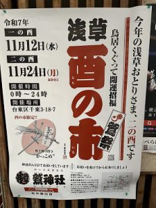 14Nov 浅草 酉の市2025 Categories: 徒蔵マップ 浅草 酉の市2025 はコメントを受け付けていません 今週の木曜(11月12日)に浅草酉の市が開催していたので、 今回はそのことを記事にします。 毎年11月の「酉の日」に、その年の暦によって1回から3回開催されます。 開催場所の鷲神社に続く道には屋台が軒を連ねていて、 とても活気づいています。 どんな様子なのか見てみようと思いましたが、 ものすごい人が来ていて入るのは断念しました。 屋台などは堪能でき、お祭り気分は味わえました。
